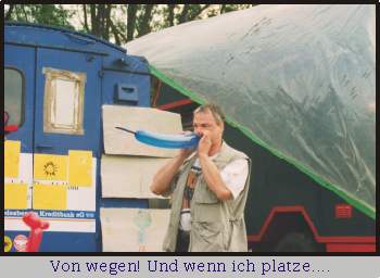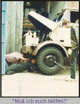 Heute ist der Tag , an dem es sich mal wieder alles entscheiden soll. Zum zweiten mal wurde unser Hanomag nun den kritischen Augen eines nörgelnden TÜV - Menschen vorgestellt. Der Miesepitter suchte nach Ölfontänen die doch bitteschön aus dem Motor zu springen hatten - bei so’nem alten Karren. Vorsicht ! , nicht persönlich werden. Dann die Fahrzeug - Ident - Nr.! Mist, war nun auch zu lesen! Dann gab’s nur noch eine Möglichkeit zum stänkern, - die B r e m s e n ! Aha! Das Magische Stichwort ! Doch auch hier wurde unser Prüferlein nicht fündig. Mit leicht rotem Kopf und zusammengekniffenen Augen stierte er nun auf den TÜV - Bogen und musste einen Punkt der Mängelliste nach dem anderen streichen. Doch was war das ? ? Das Kerlchen fängt wieder an zu grinsen und meint nur : „Nun den, dann wollen wir doch mal sehen, was die Tachoeichung uns sagt !" Das war der einzige Punkt, der auch von uns nicht abgehackt werden konnte. Doch wie sagt man so schön : Nur Mut zur Lücke!. Unsere Lücke, in die wir hoffentlich still und leise verschwinden konnten hieß WOHNMOBIL. Denn jeder Mensch weiß doch, das ein Wohnmobil keine Tachoscheibe braucht - oder ?! Also legten wir los :"Ähm, Herr Prüfer, dieses ist ein Wohnmobil und Ihr Herr Kollege hat gesagt, das wir diesen Punkt gar nicht beachten sollen. Er hätte sich da vertan." „ Aha! Ein Wohnmobil ist das ? Das ist ein LKW ! und kein Wohnmobil, oder ist der ausgebaut ?" „Ähm, nein ! Aber wir sind dabei !" „Dann muss ich mich erst einmal erkundigen und nachfragen was das für ein scheiß ist ." Sprach und verschwand. Nach einiger zeit kam er wieder mit noch roterem Kopf und sichtlich bemüht nicht handgreiflich zu werden. Griff in sein Kistchen mit dem Stempel und .....haute diesen auf unsere Papiere ! Ärger beim Prüfer, Freude bei uns ! Wir hatten es geschafft, unser Hano hatte TÜV, als LKW ohne geeichten Tacho ! Juuchuuu!!!
